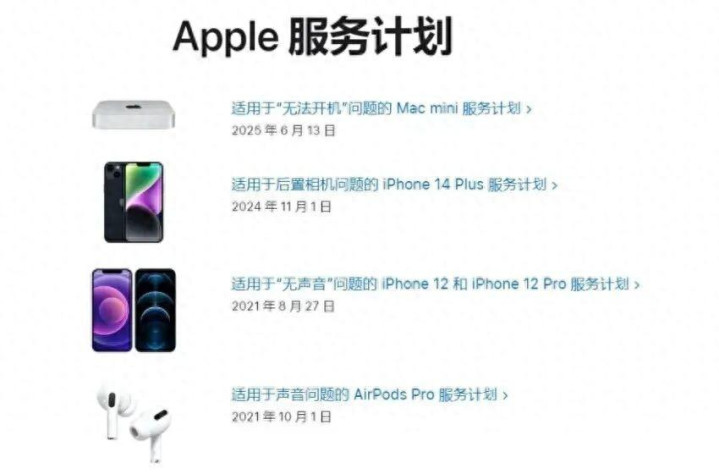 更早之前,苹果还发布过多项设备维修计划,例如针对 iPhone 12/12 Pro 的 “听筒无声” 问题维修计划、针对 AirPods Pro 的 “音质问题免费换新” 计划等。