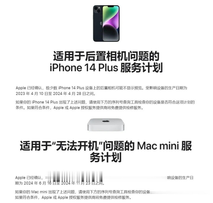 需要注意的是,目前 Mac mini M2 和 iPhone 14 Plus 的免费维修计划仍处于有效期内。