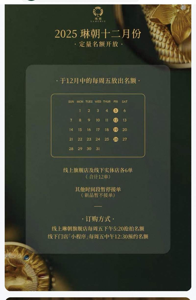 公开资料显示,琳朝成立于2006年,最初是一家深耕本地黄金手工艺的传统企业,长期仅在兰州保留一家实体门店。门店工作人员表示,除日常开放参观外,12月每周仅在周五限量售卖,每天6个名额,所有订单均需提前预约,工期约12个月。天猫旗舰店则显示:其每周五放出名额,线上旗舰店及线下实体店各6单,合计12单。